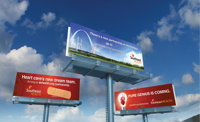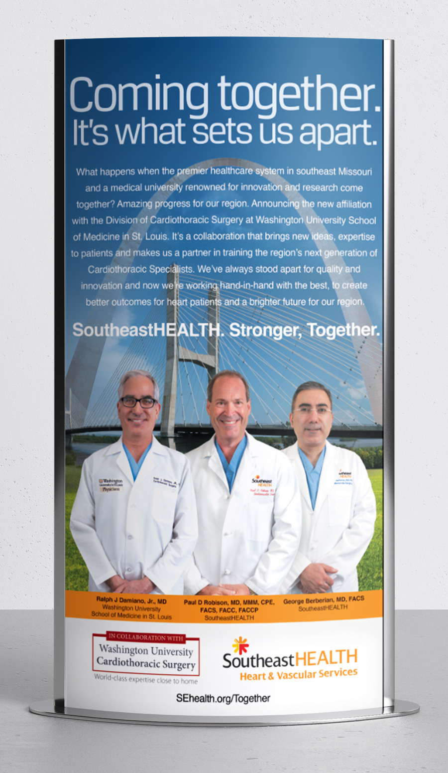 Advertising layouts across various mediums included the campaign headline “Coming Together. It’s What Sets Us Apart.” Prior to the campaign kick-off, we launched a teaser campaign to build anticipation of this announcement. The teaser creative, featured visuals of iconic landmarks from both cities. For St. Louis, we used the Gateway Arch image and for Cape Girardeau, we used an image of the Bill Emerson Memorial bridge. This was a visual representation of the bringing together of our two entities and the marriage of the value our community hospital offers with the innovation and excellence only a world-class university can provide.